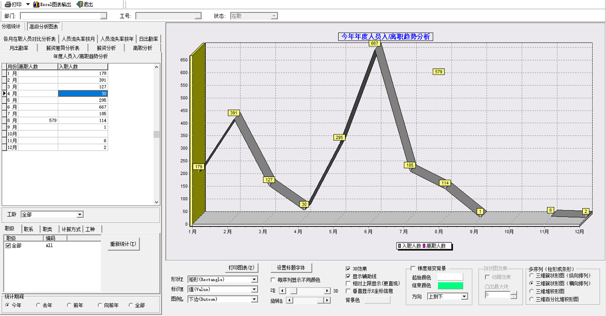 通過同鑫人事管理軟件中的高極分析圖表,按照員工的月出勤率,日出勤率,流失率,薪資差異分析等,實(shí)時(shí)掌握員工每個(gè)時(shí)間段的出勤情況,離職情況及各個(gè)崗位的薪資情況,