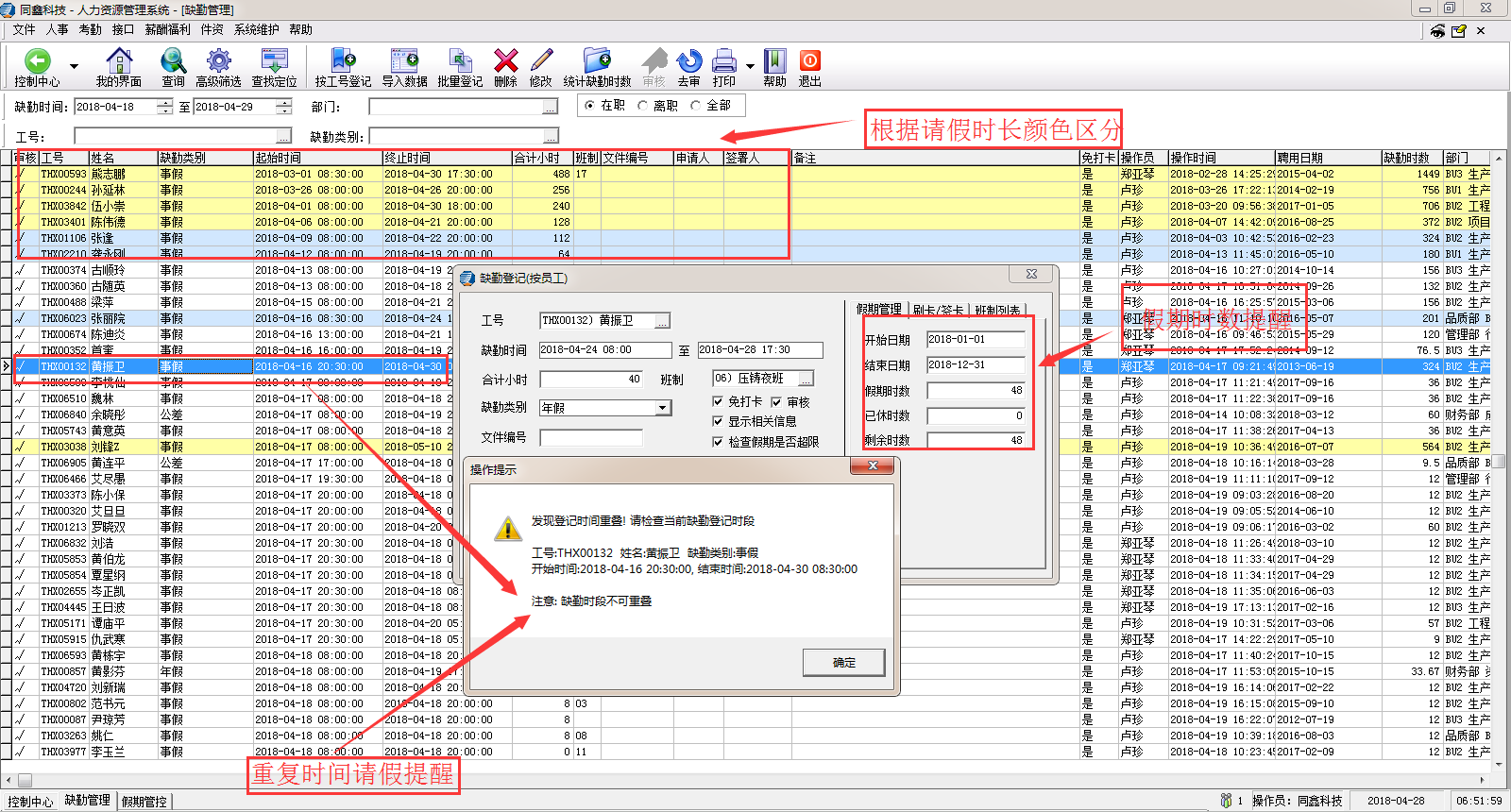 2、在請假控制方面,可以根據(jù)員工的請假時長設(shè)定不同的顏色進(jìn)行區(qū)分,同時針對于不同的請假類別以及重復(fù)的請假輸入進(jìn)行控制,做到防呆提醒功能,以減少HR管理者請假事務(wù)性工作的出錯率。