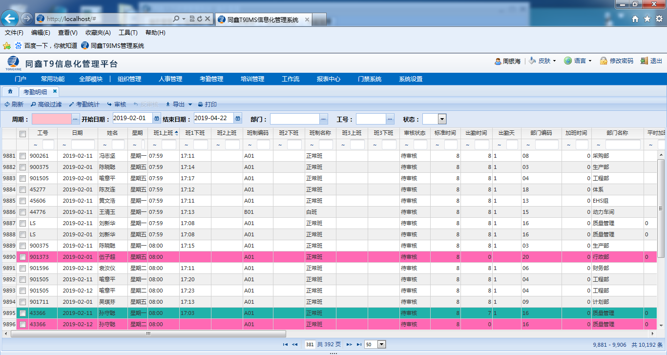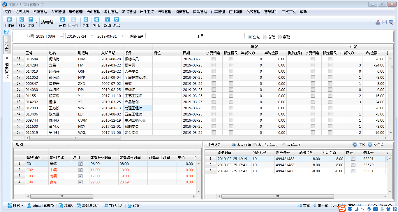 2.同鑫人力資源管理系統上線情況: 上線模塊有,人事/事務/考勤/門禁/消費/報表等