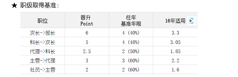 2.定義每個關鍵職位的任職標準,如社員升為主管需要多個任職年限,需要多少考核指求點,可以追溯往年的所有考核指標項目,現將該企業的職位升職資格表附下圖: