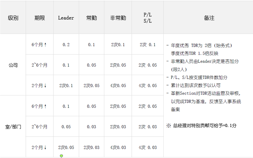 3.定義了七個職級的任職審核年限標準,每個職級劃分為1年、2年、3年、4年及4年以上的認證年限,并定義了每個職級的加減分項:人事評價、獲獎、TDR、語言能力、資格證/留學、社內講師/內部OJT、標準改善、提案、N-TED等方面的考核加減分項;對必要資格定義如下:革新學校結業(在職期間需通過1次即可),且為學校結課時排名為參與人員的前10%,加分處理為第1名:0.1分;第2名:0.05分;而科長升為次長:TOPIK需要2級以上;次長升部長:TOPIK需3級以上;附圖為任證年限標準: