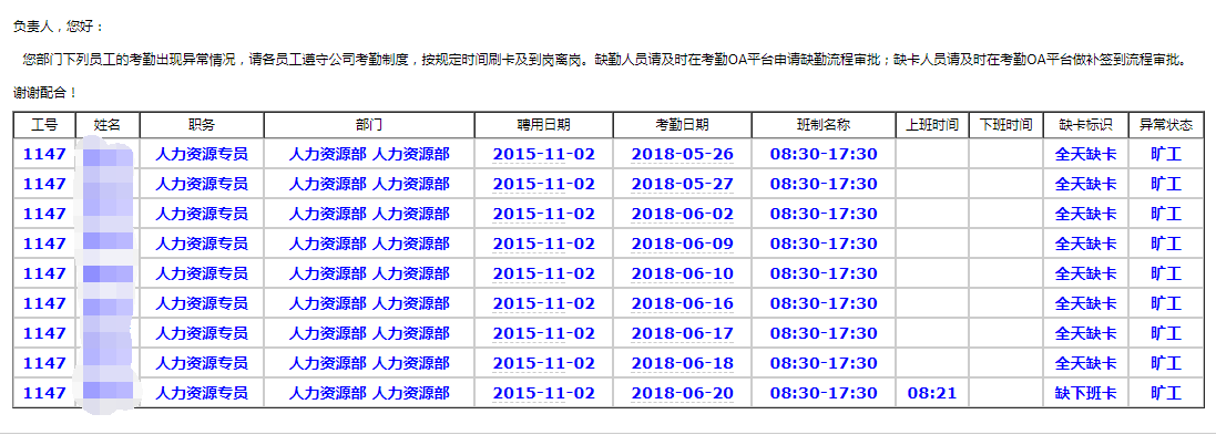 3、異常考勤通過郵件自動推送,即可推送到部門領導、班組長,也可直接同送到員工本人,相關異常直接通過工作流處理完畢直接進入考勤數據。