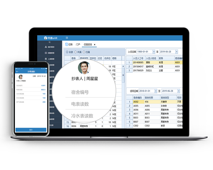 ●自動生成宿舍床位編號和上下鋪;● 可視化的宿舍床位管理,綜合顯示已住人數和空床位數明細;● 員工從入住到退宿全過程記錄;● 支持宿舍物品配置及維修費用管理,自動計算分攤水電費;● 通過APP實現在線申報宿舍維修和填抄水電表讀數;